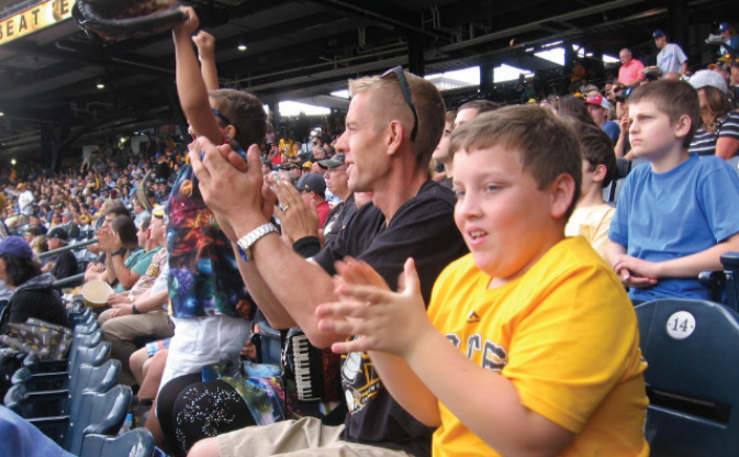 Austin Ball, 9, and his father, Derek, of St. John the Baptist in Lyndora, Pa. root for the Pittsburgh Pirates during their game versus the Los Angeles Dodgers at PNC Park on Aug. 24. The event was part of the 10th annual “Faith and Fun Day” for altar servers. Photo by David Mayernik Jr