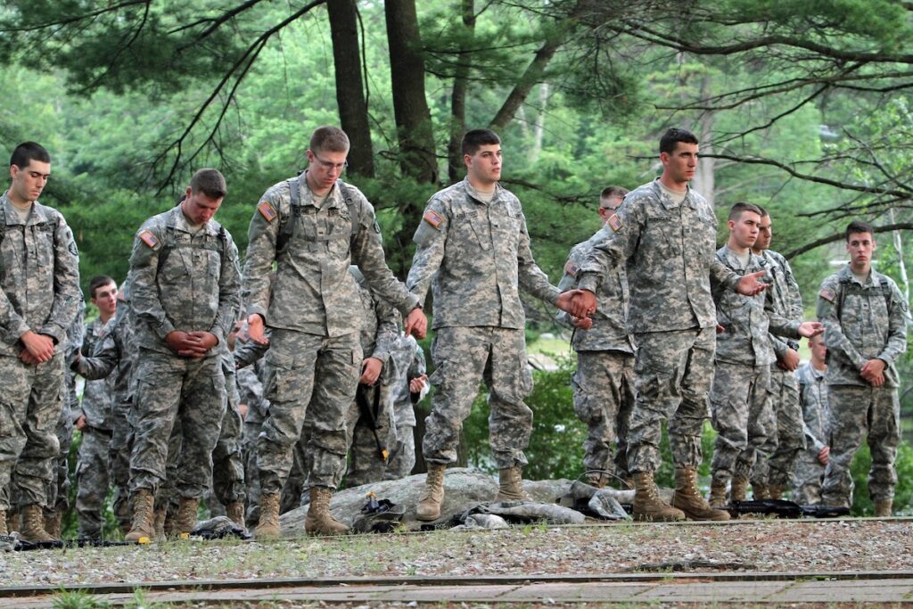 U.S. Military Academy cadets are pictured in a file photo holding hands during the Lord’s Prayer while attending Mass at Camp Buckner in West Point, N.Y. (OSV News photo/Gregory A. Shemitz)