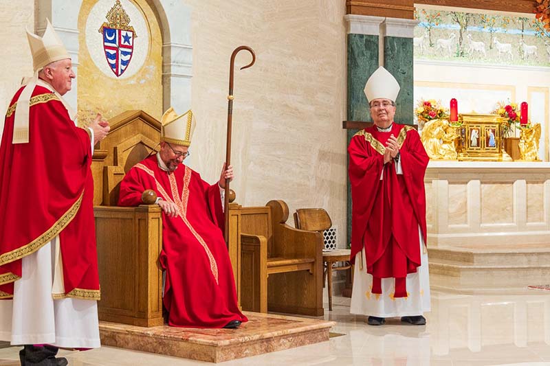 Archbishop Rozanski and Cardinal Pierre led Bishop O’Donnell to the cathedra, or bishop’s chair, in the cathedral sanctuary.