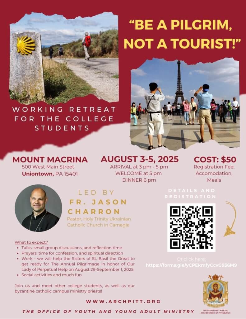 The retreat will be led by Fr. JASON CHARRON, Pastor of the Holy Trinity Ukrainian Catholic Church in Carnegie who will be speaking on the topic: “BE A PILGRIM, NOT A TOURIST!”